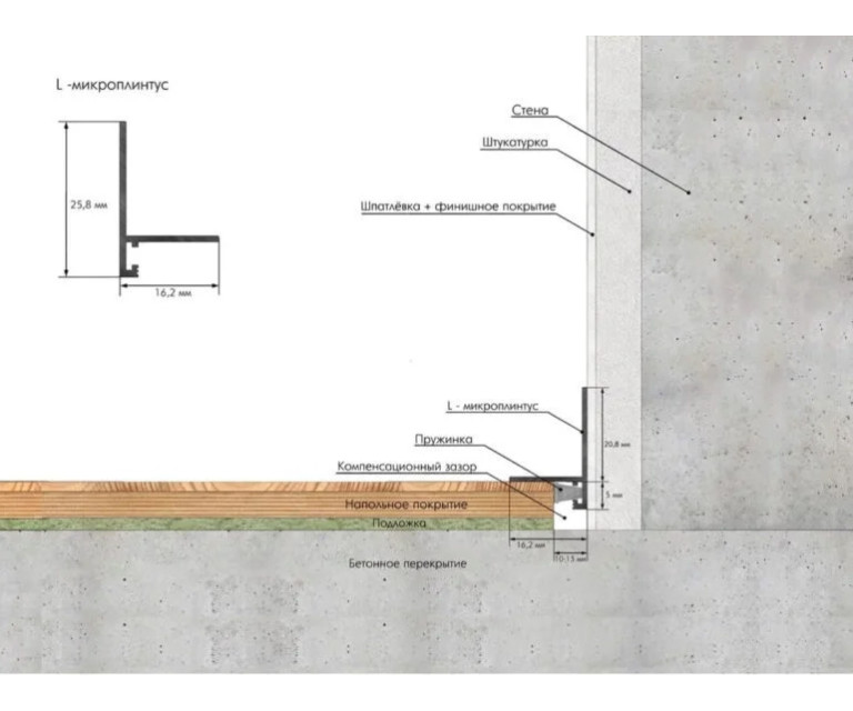 Микроплинтус полностью исключает использование накладного плинтуса по стене и сохраняет чистоту дизайна.