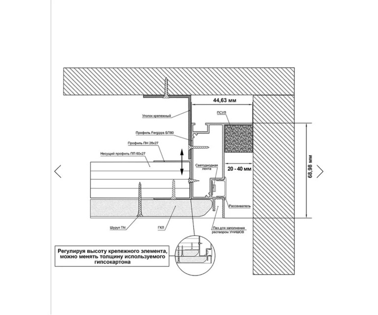 • Профиль крепится к основному потолку и вписан в каркас потолка из гипсокартона, что позволяет нивелировать усадку стен в новых домах, а значит гарантирует прочность и надёжность