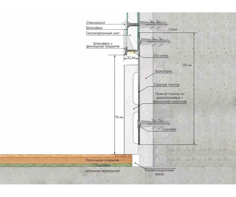 Скрытый плинтус это напольный профиль который устанавливается в плоскости стены и предназначен для аккуратного оформления стыка между полом и стеной. Такое решение делает интерьер более чистым и современным без выступающих элементов. Подходит для ламината, паркета и плитки. Используется в жилых, коммерческих и офисных помещениях.