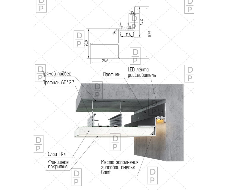 Теневой зазор шириной 13 миллиметров даёт возможность без труда обновлять интерьер. Вы можете переклеить обои или перекрасить стены, не затрагивая потолочную конструкцию. Профиль формирует аккуратный лёгкий теневой эффект, а при установке светодиодной ленты позволяет создать более выраженное ощущение парящего потолка.